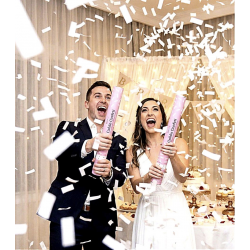 Añade un momento mágico e inolvidable a tu boda con nuestros cañones de confeti de papel blanco. Diseñados para crear un efecto elegante y espectacular, son ideales para la salida de los novios, el primer baile o cualquier instante especial.