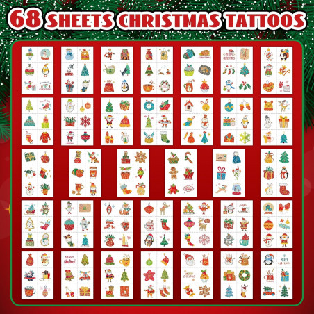 Incluye 408 tatuajes (aprox. 4 x 4 cm cada uno) con motivos clásicos como Papá Noel, renos, árboles de Navidad, copos de nieve, regalos, campanas y botas navideñas.